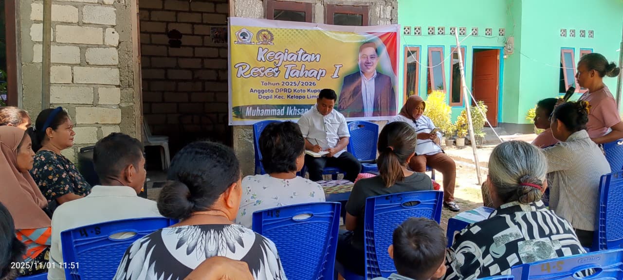Kupang-NTTLine, Sekretaris Fraksi Partai Golkar DPRD Kota Kupang, Muhammad Ikhsan Darwis, melaksanakan Reses Tahap I Tahun 2025/2026 di Kelurahan Lasiana, tepatnya di RT 22 RW 05, Sabtu (01/11/2025). Kegiatan ini menjadi ajang bagi warga untuk menyampaikan berbagai kebutuhan dan persoalan yang dihadapi di lingkungan mereka.
